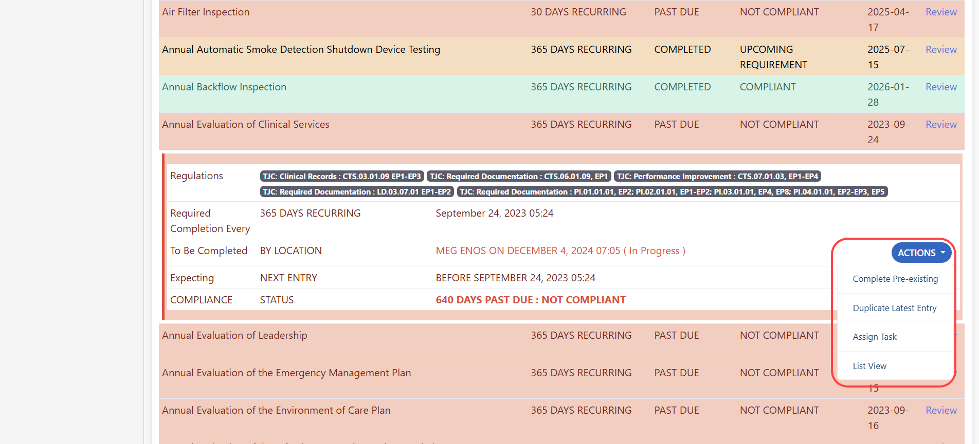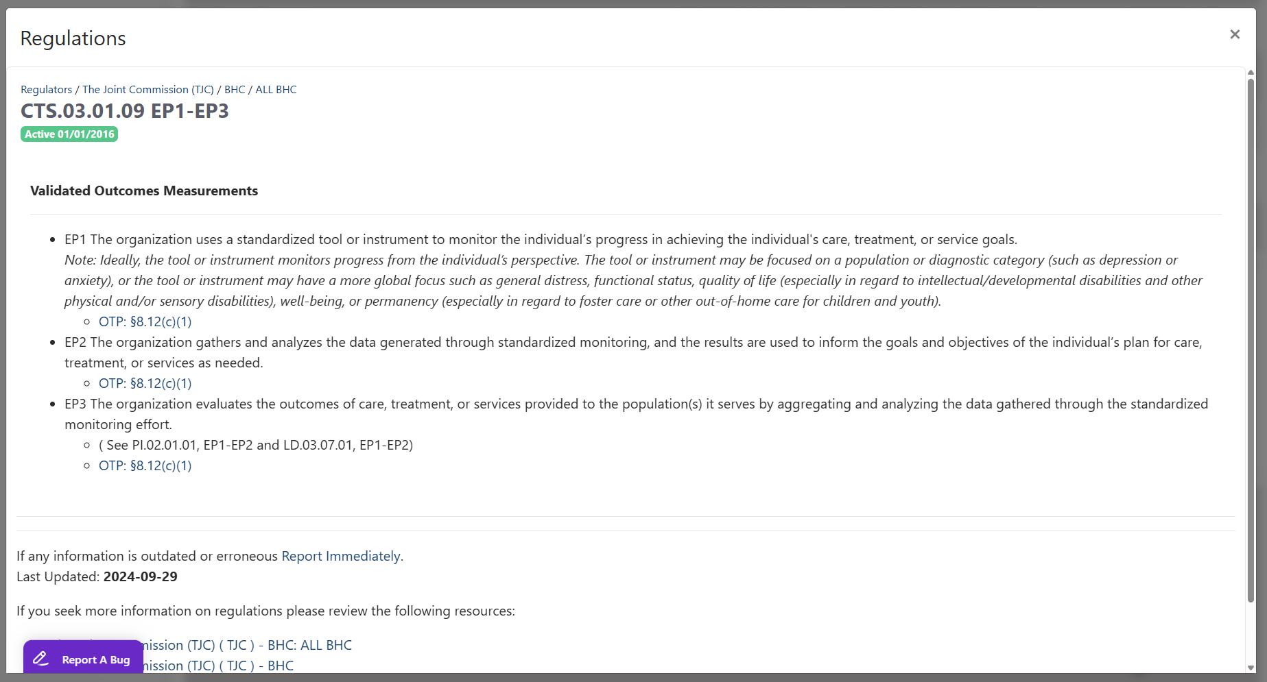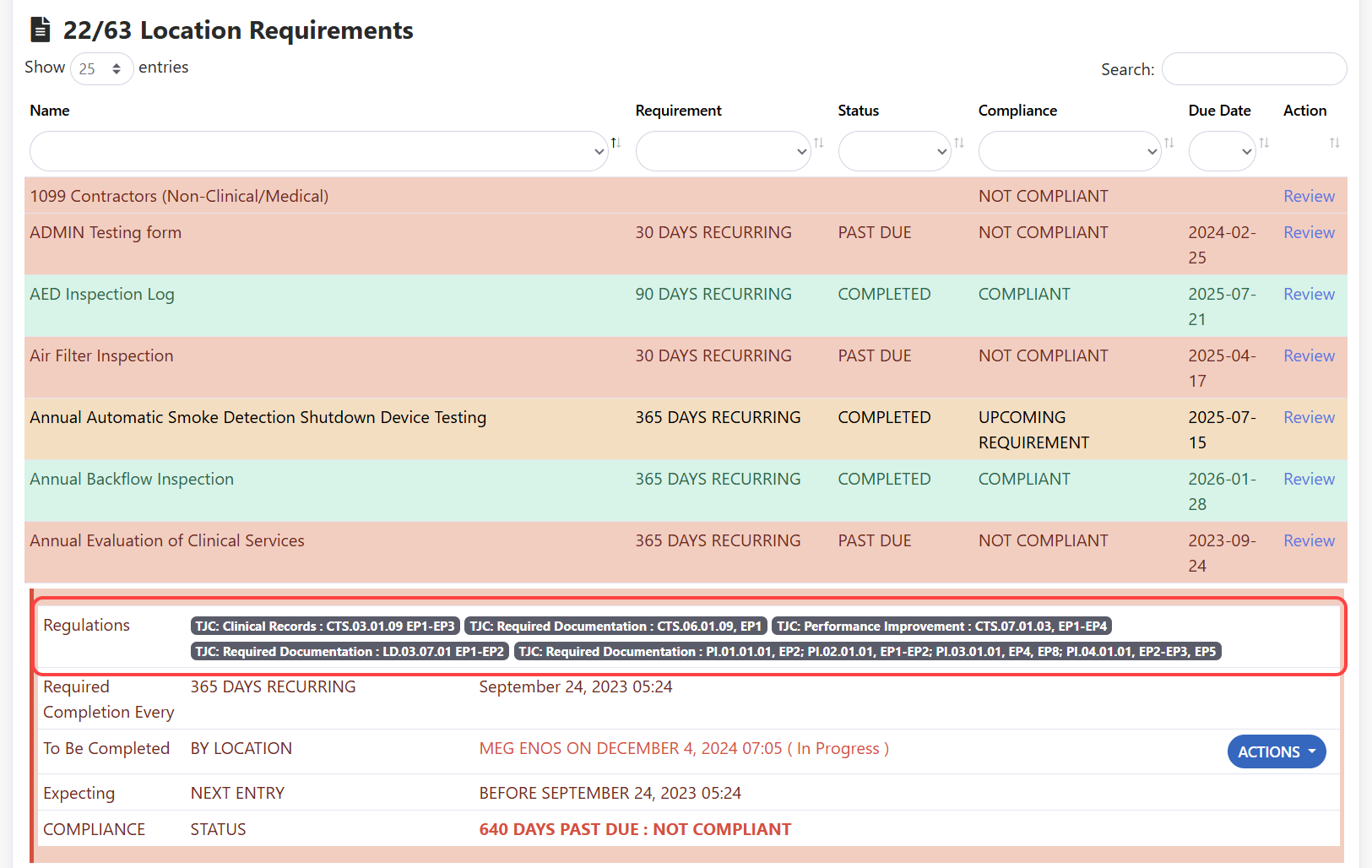 - Use the filters at the top to choose between All, TJC (The Joint Commission), or State regulations.
