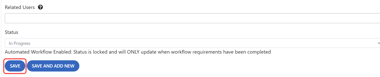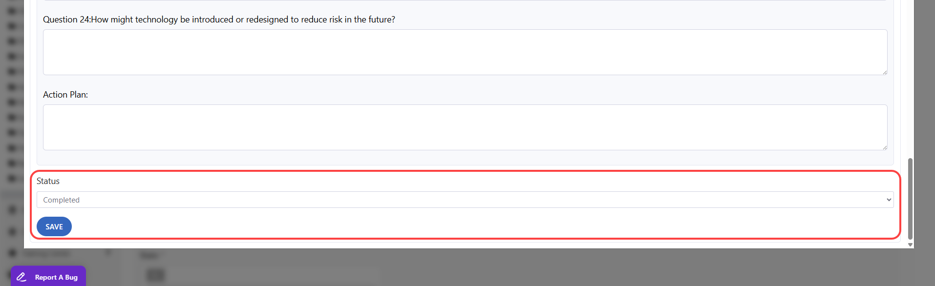 - Fill out all required sections of the Root Cause Analysis form. Then Select a Status at the bottom of the form and click Save.