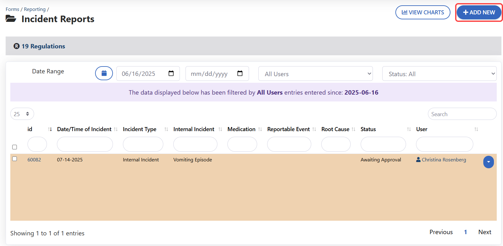 - After locating the form, Click the Add New button in the top right corner to create a new Incident Report.
