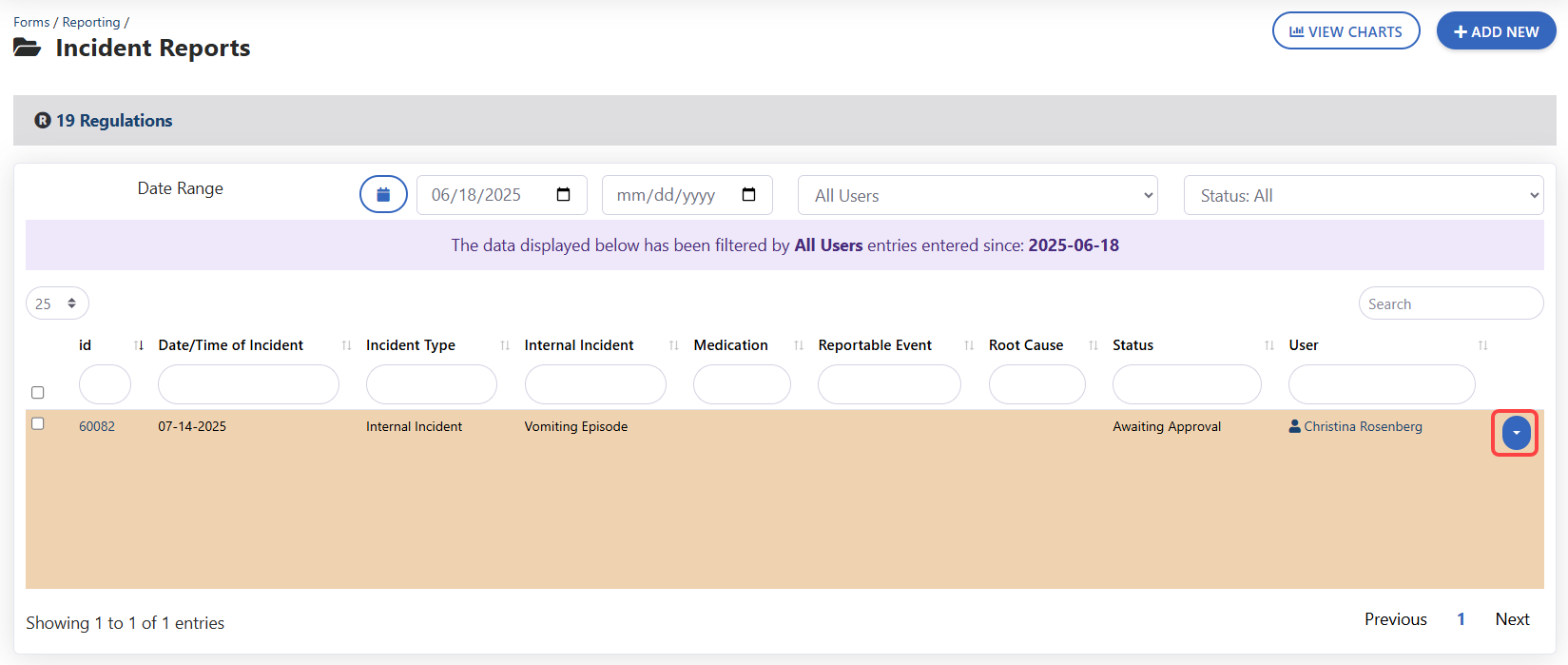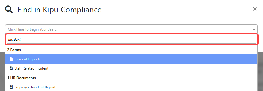 - Begin typing the name of the form in the Find in Kipu Compliance window and select the correct option in the drop-down
