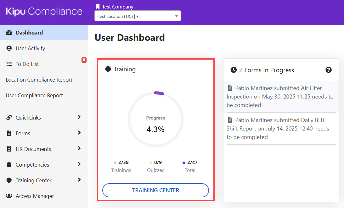Use the Training Center in Kipu Compliance to track, complete, and manage certifications based on the role or roles assigned to your user profile. This tool helps ensure you stay up to date with all training requirements and maintain compliance.