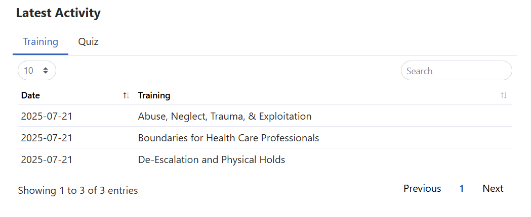 - On the right side of the Training Center, use the Latest Activity section to review your most recent completed trainings.