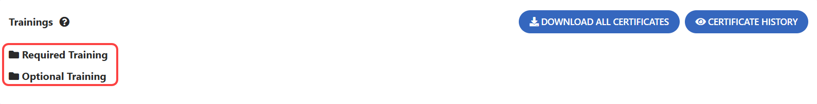 - The Trainings section allows you to click on the Required or Optional Training folders to see all the available trainings based on the role(s) assigned to your user profile.