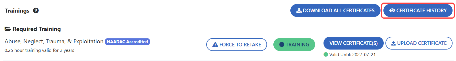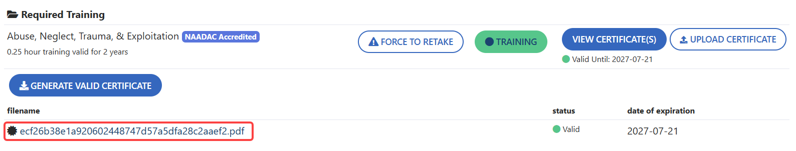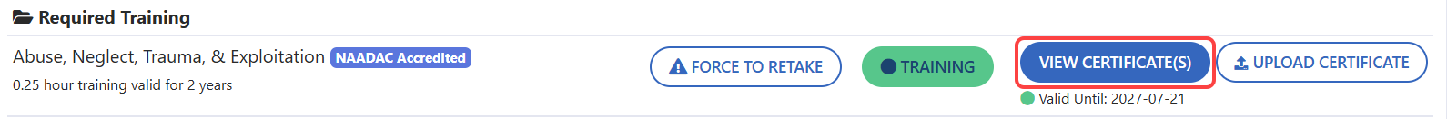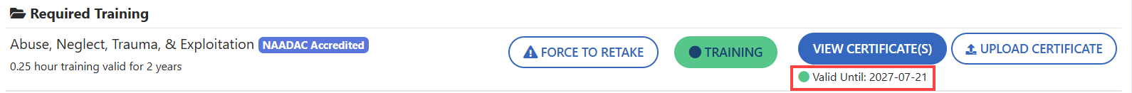 - As you complete required trainings, the system automatically schedules renewal dates based on your state or accrediting body’s guidelines. For example, if you complete Abuse, Neglect, Trauma, and Exploitation training, it will show as valid until the renewal date listed.