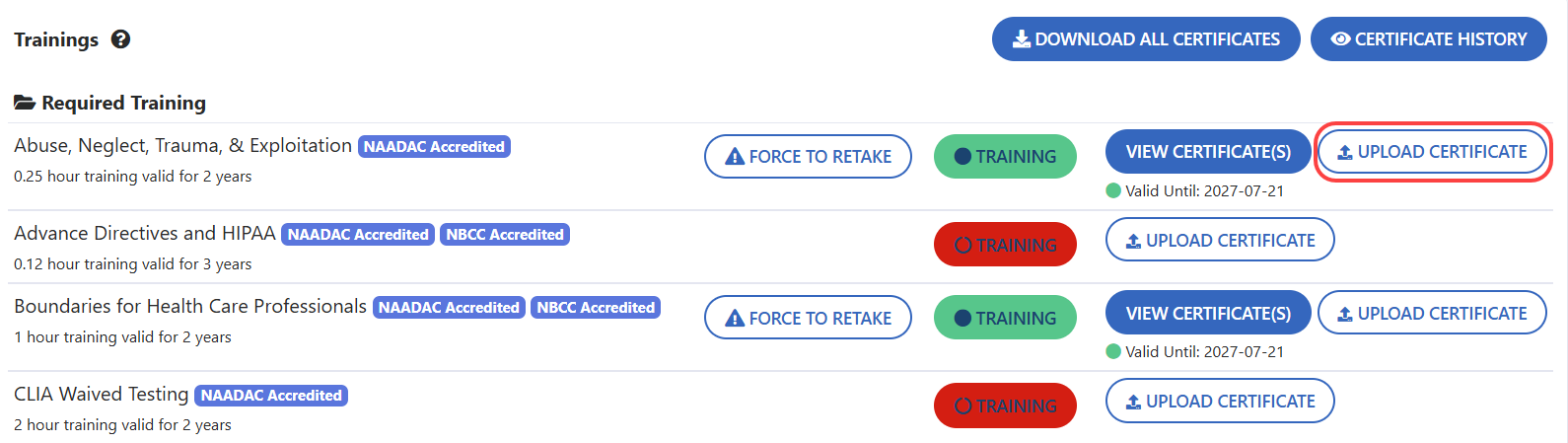 - Alternatively, you may upload a valid certificate if the training was completed outside of Kipu Compliance by clicking the Upload Certificate button and uploading the appropriate file.