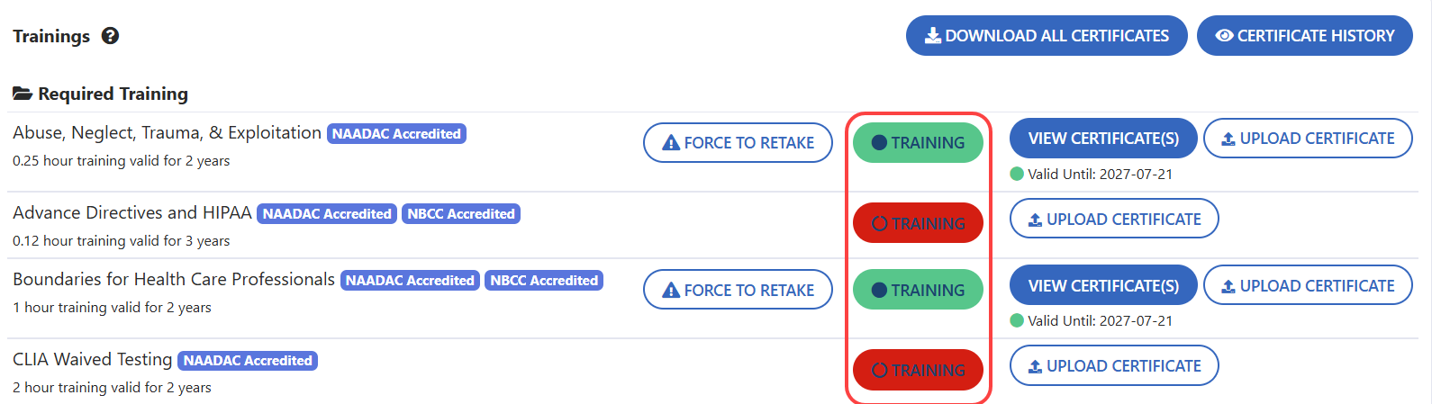 - Trainings with the green Training button have been completed, while incomplete trainings are red. Clicking on the red Training button will allow you to complete the training directly in the system.