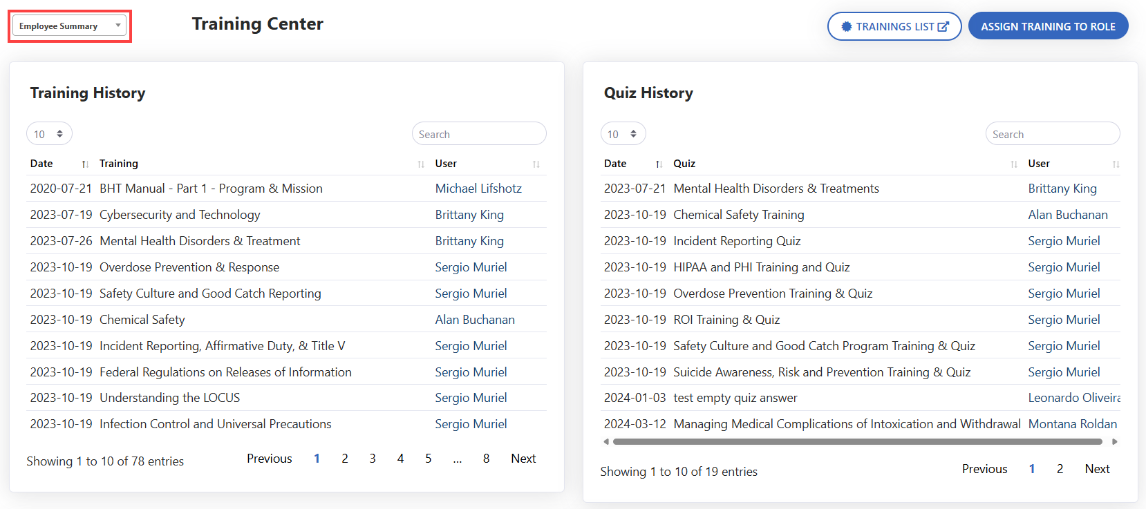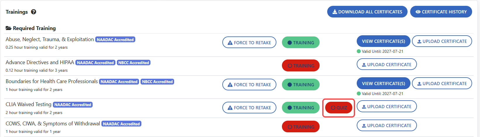 - Scroll down to the Trainings section. Locate the quiz that needs to be reset. Click the red Quiz icon to view submission history.