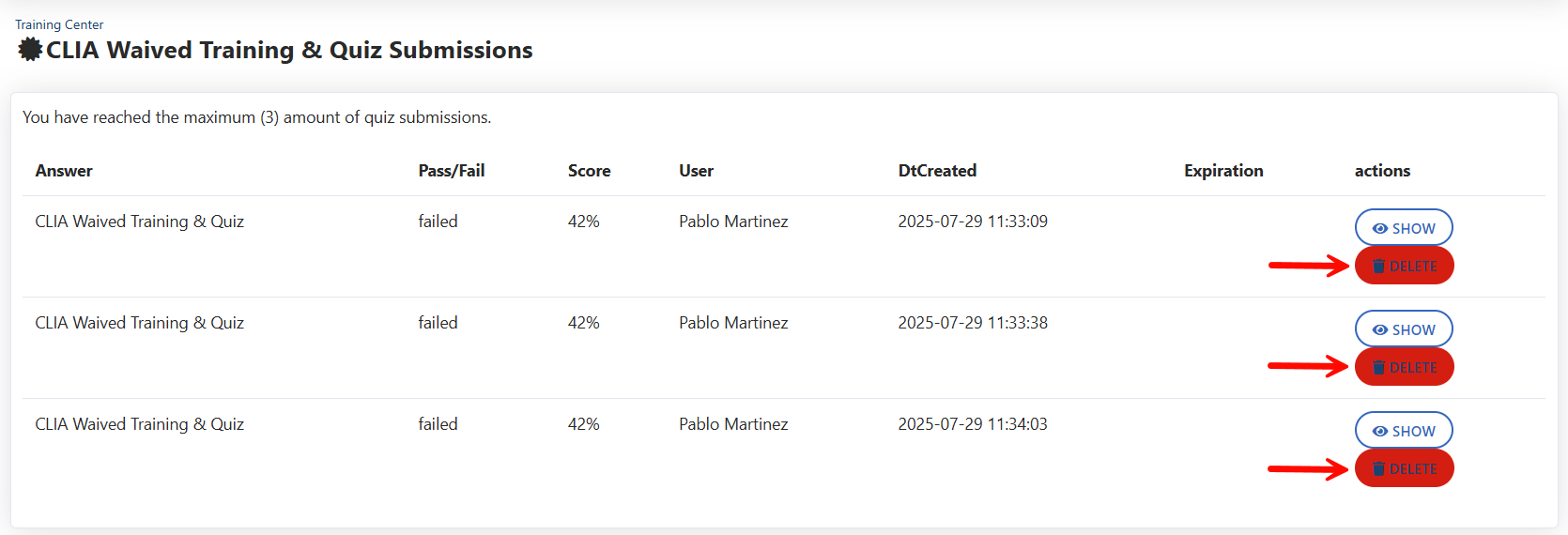 - Click Delete next to each attempt to permanently remove them.