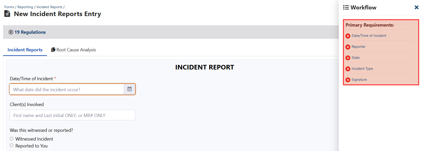 - Once the form opens, the Workflow panel on the right will display this forms primary requirements.
