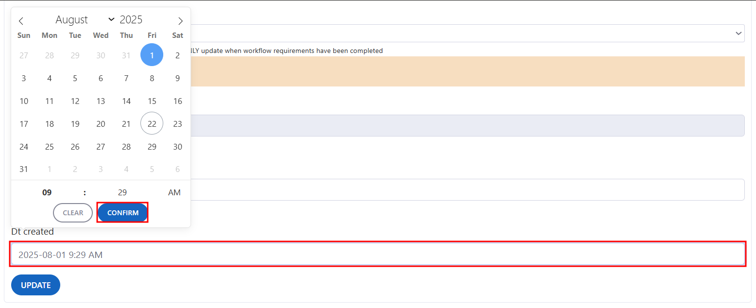 - Scroll to the bottom of the form and change the Dt created field to match the date of entry. Select the blue Confirm button.