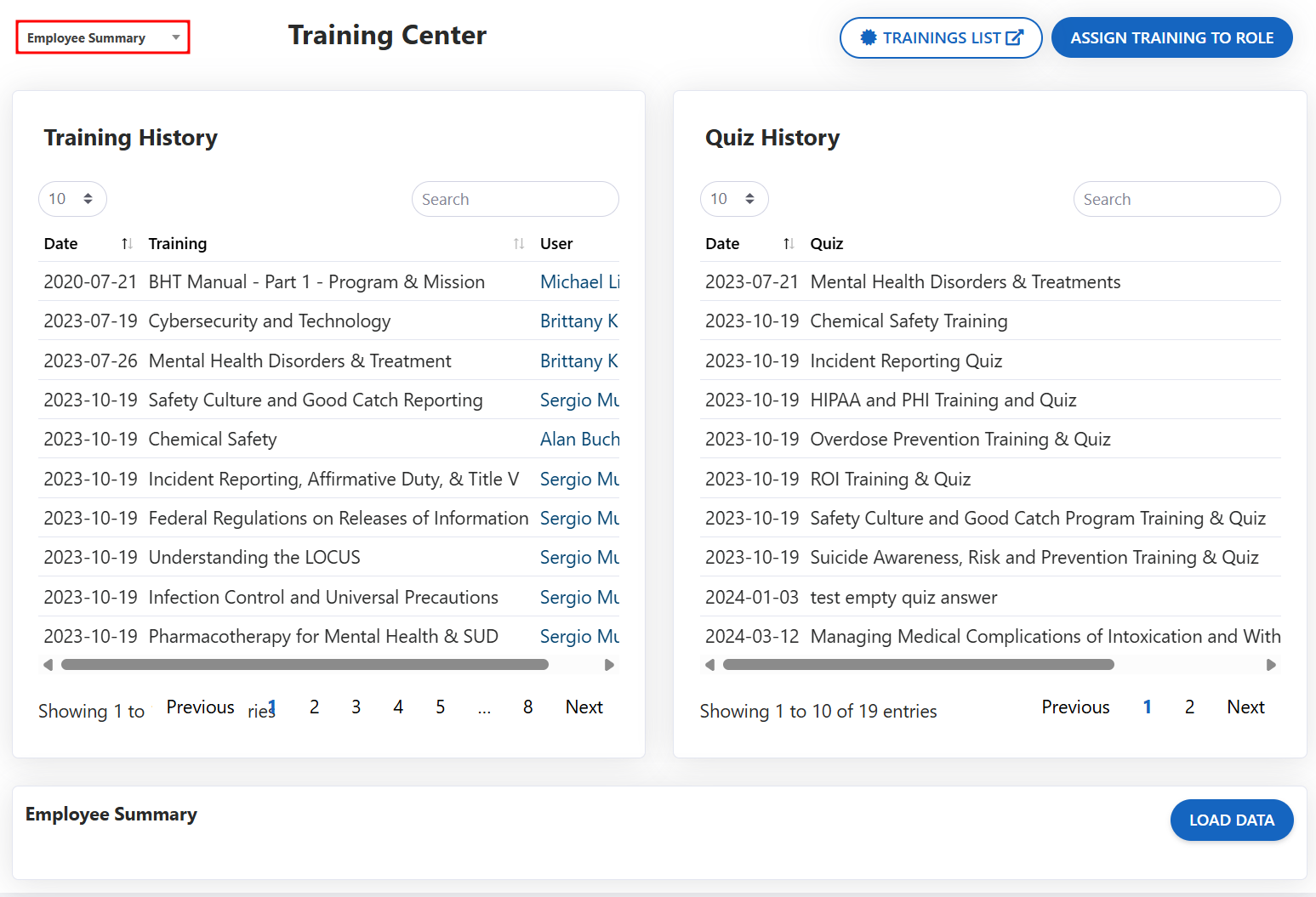 - Within the Training Center Employee Summary page, you will be brought to the employee summary this will allow you to oversee the employees' within the location by selecting the Load Data button in the top right of the Employee Summary at the bottom of the page.