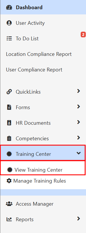 - Select the Training Center tab from the toolbar on the left. From the drop-down select View Training Center.