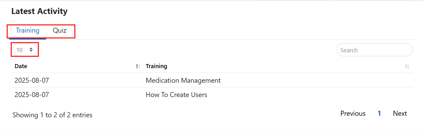 This will show the last 10 Trainings the user has completed and can be changed over to show the Quizzes that have been completed. To see more than 10 select the bubble with 10 and choose from the available drop-down.