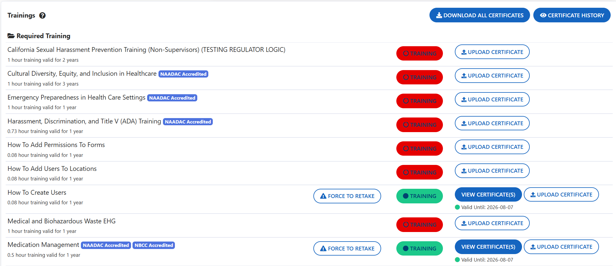 - From here you can view, upload any certificates for the trainings that have been completed outside of Kipu Compliance to satisfy the requirement, and if needed can push the training back to the user for completion by selecting the Force To Retake button.