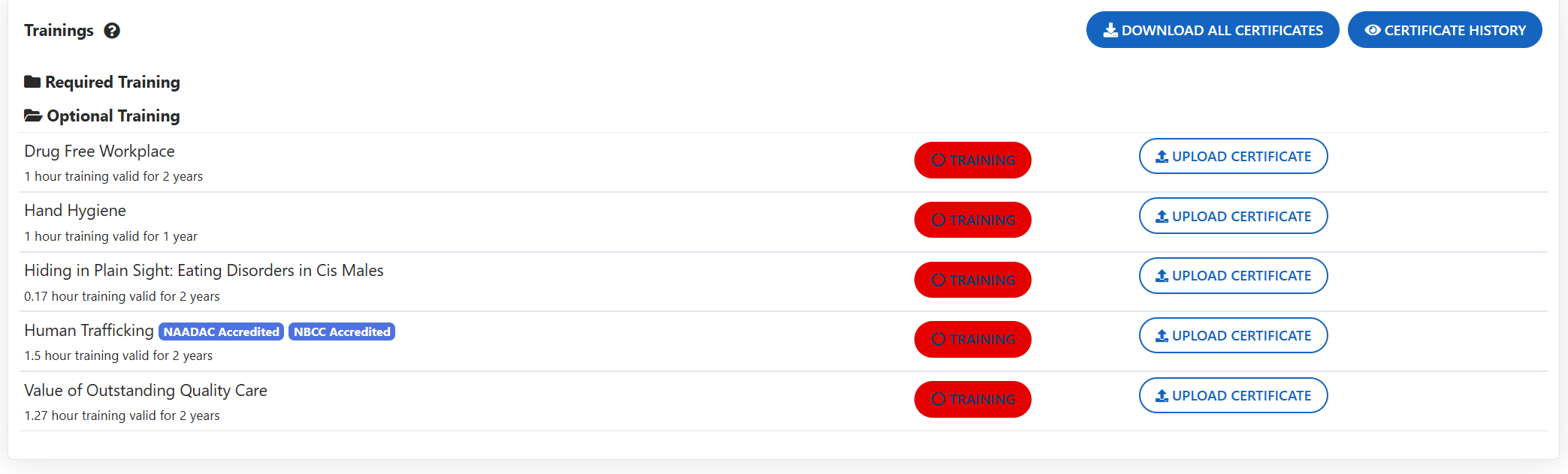 Optional Trainings are any that your facility has deemed appropriate to complete but are not connected to any regulations connected to your accrediting body.
