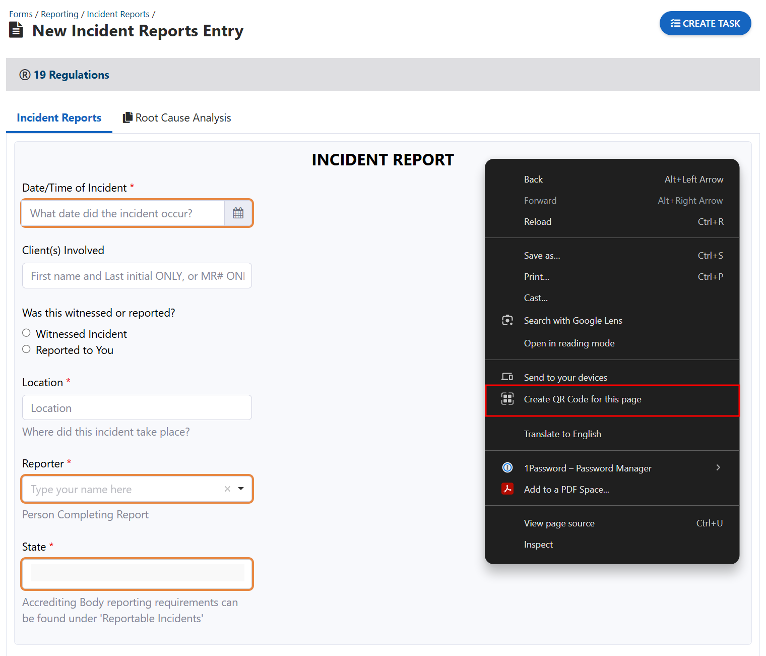 - On the page for the form, right-click with your mouse anywhere on the form and select Create QR Code from the options.