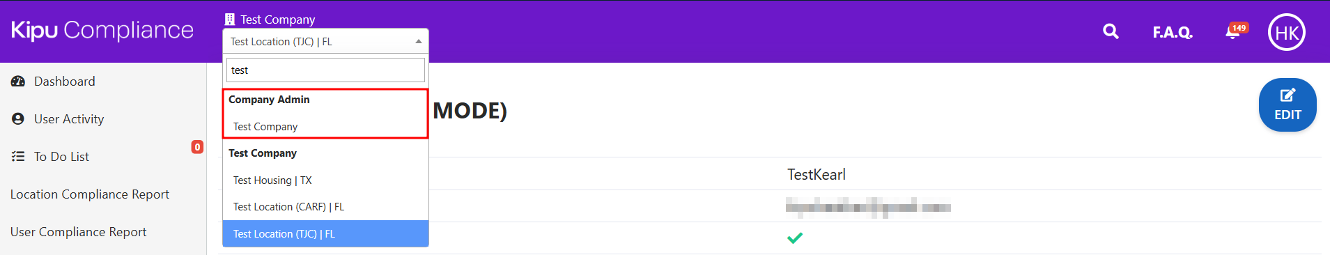 - Select the name of your location/facility from the drop-down within Kipu Compliance under the Company Admin header.