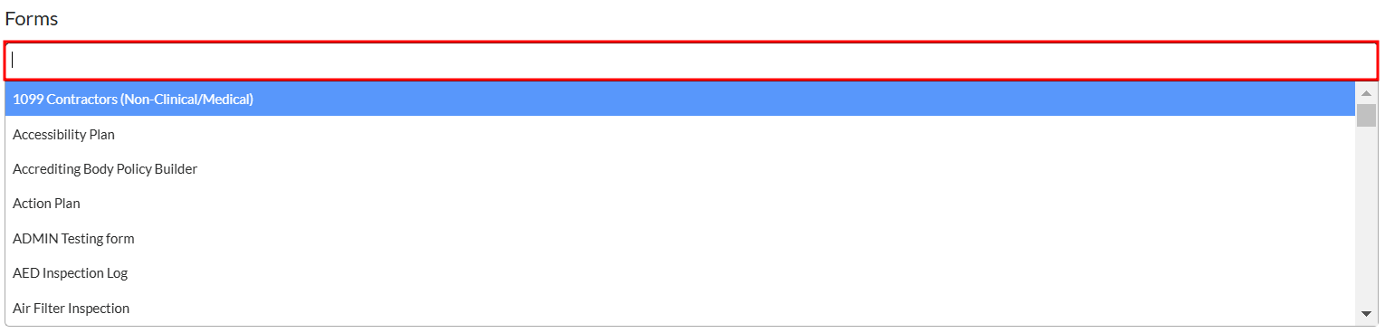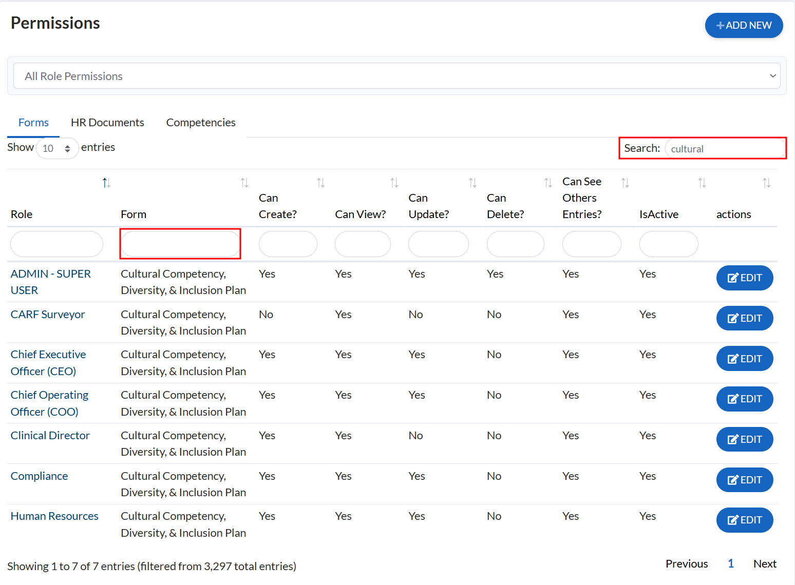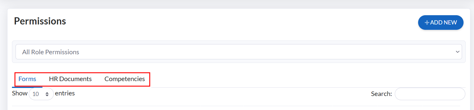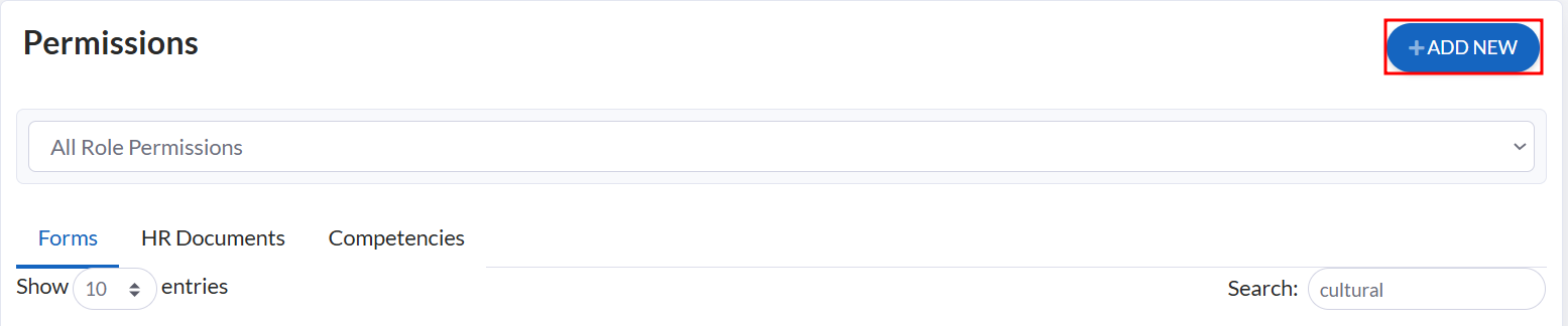 You are automatically loaded into the Forms section. Select HR Documents or Competencies to create a new Permission under the different sections as needed. - Type the name of the Form/HR Doc/Competencies within the search field.