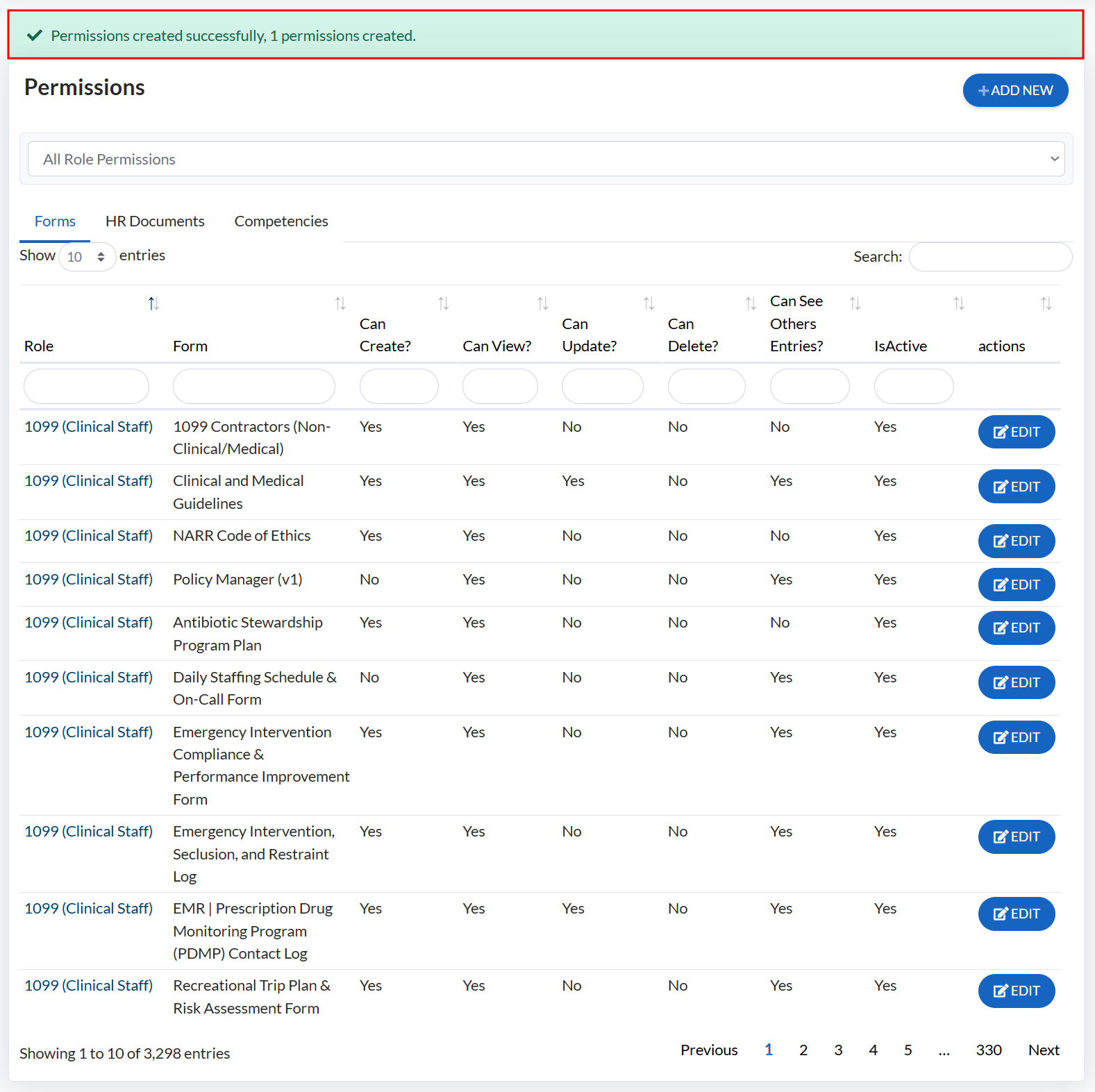 Minimum selections would be Can Create? and Is active. - Select the blue save button and it will redirect you back to the previous Permissions list view.