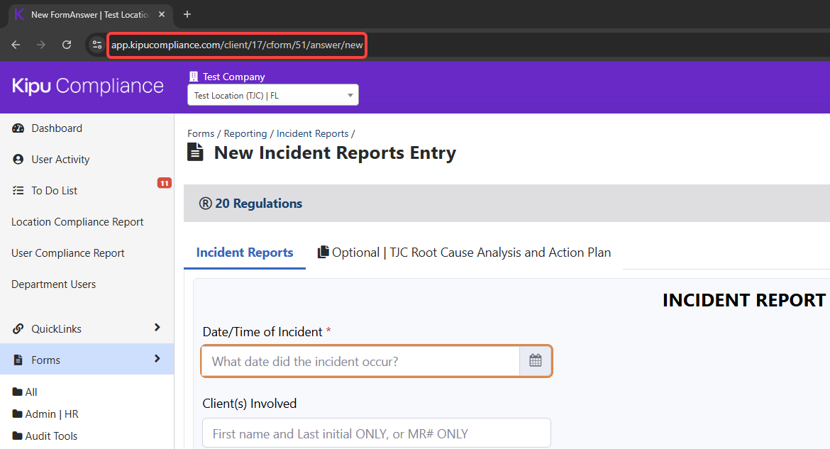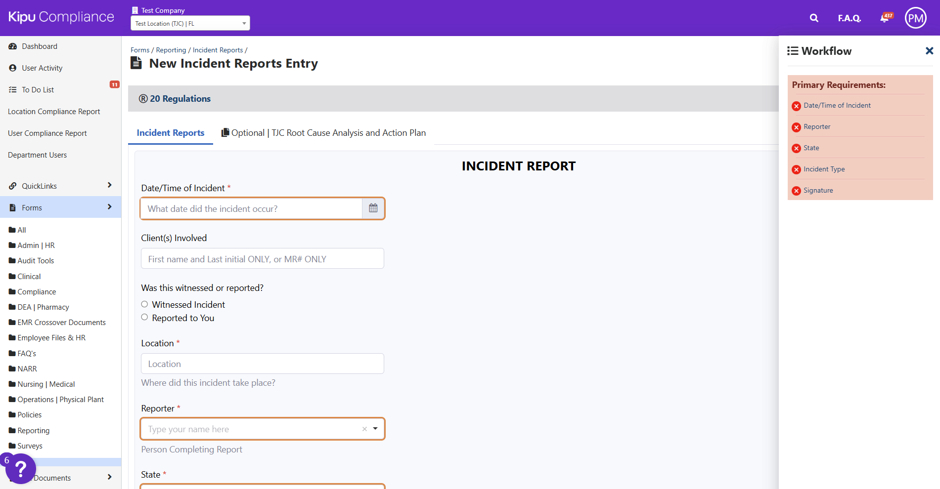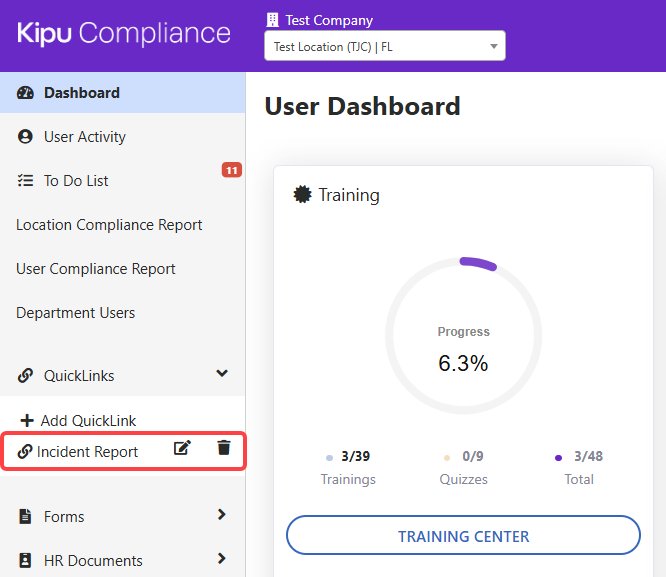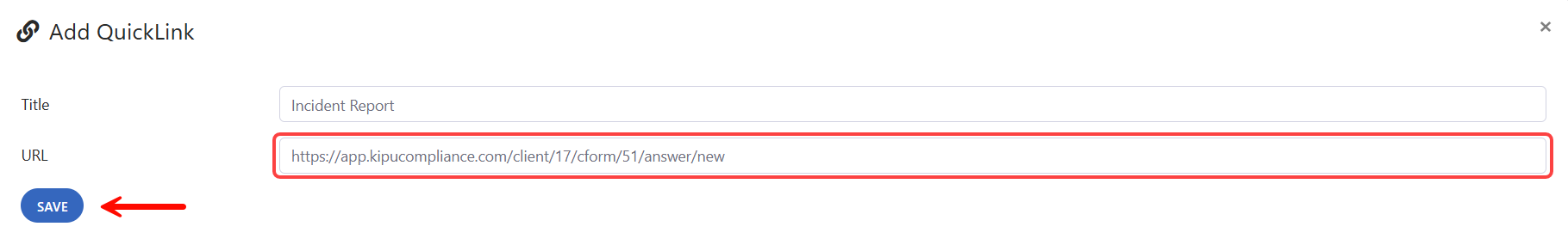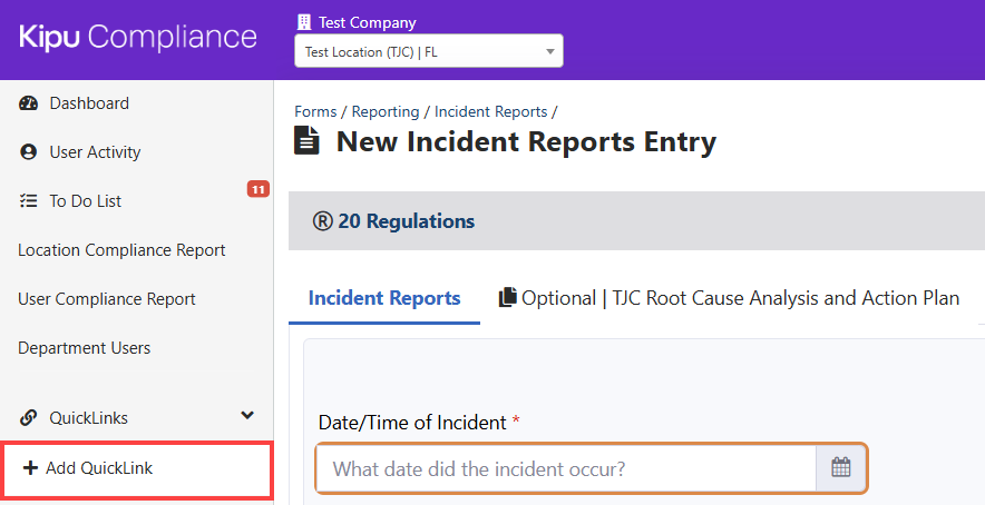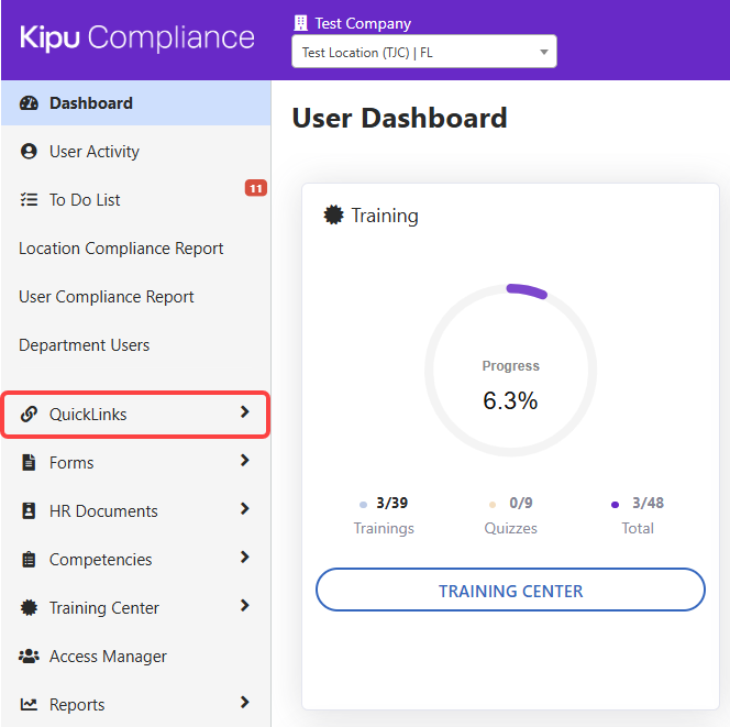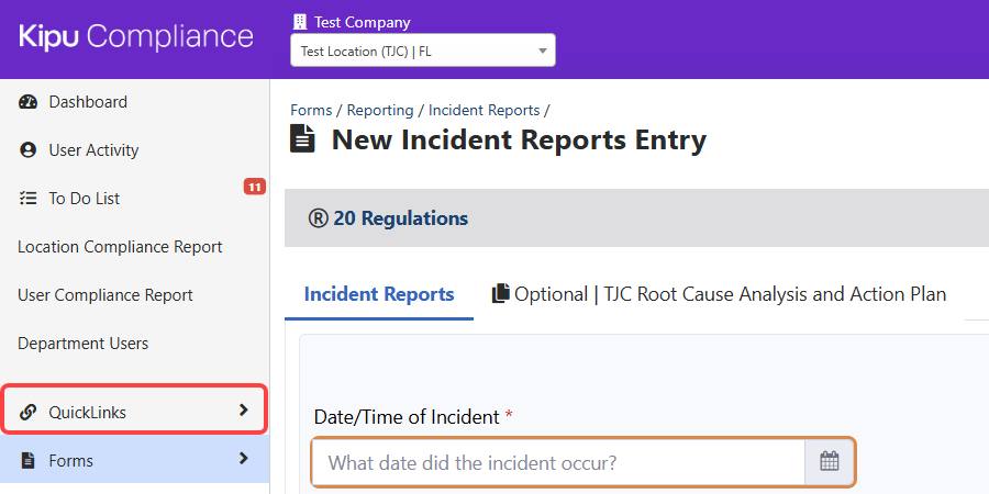 QuickLinks help improve efficiency by providing one-click access to important areas within Kipu Compliance. This feature is especially useful for users who regularly access the same forms or reports throughout the day, streamlining their workflows and reducing time spent navigating through the system.