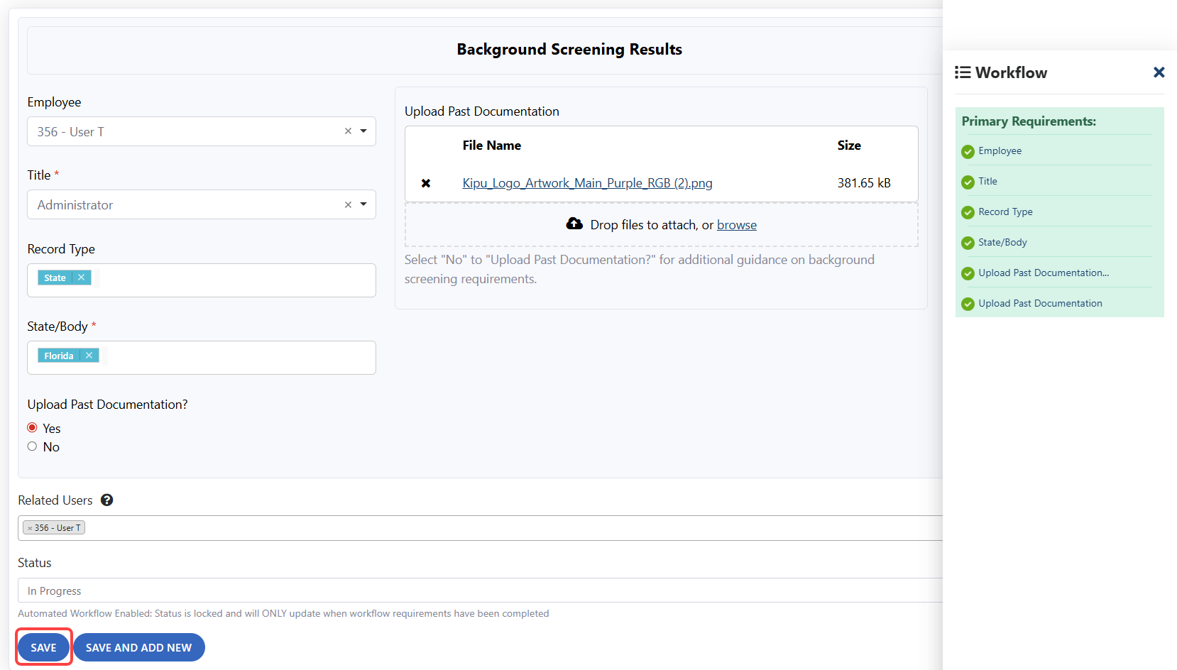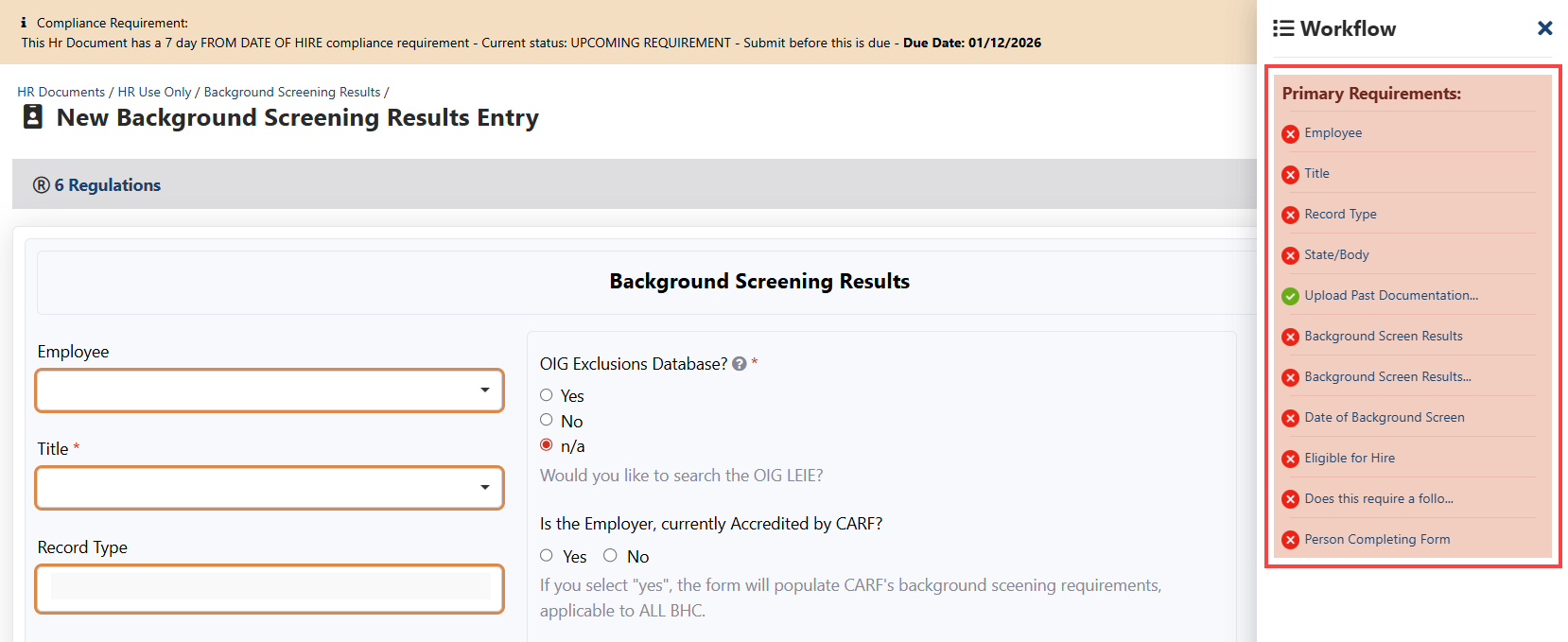 HR documents completed before your facility used Kipu Compliance must still be uploaded into the system and must reflect the original completion date, not the upload date, to ensure accurate compliance tracking and reporting.