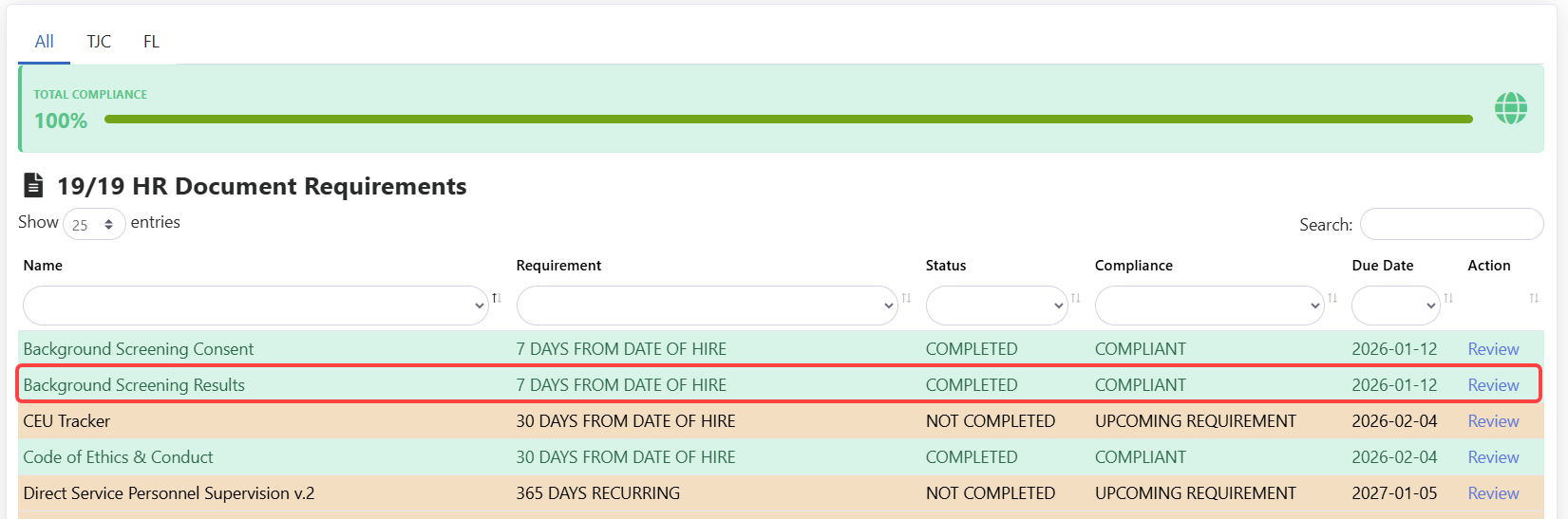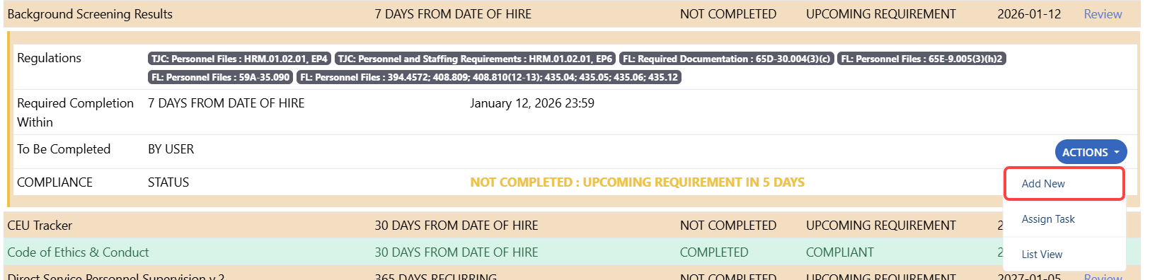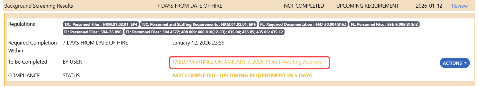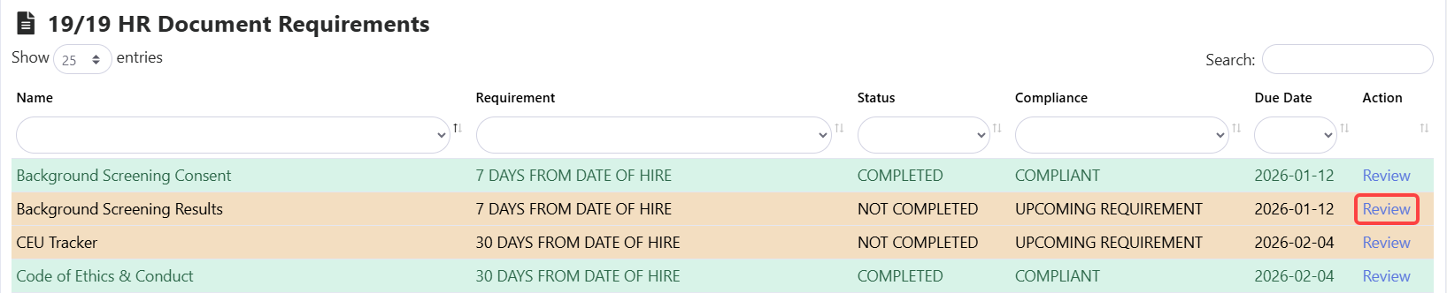 HR documents are assigned due dates based on an employee’s date of hire and role-based requirements set by accrediting bodies or state regulations. Updating the document date in the process ensures the system evaluates compliance correctly.