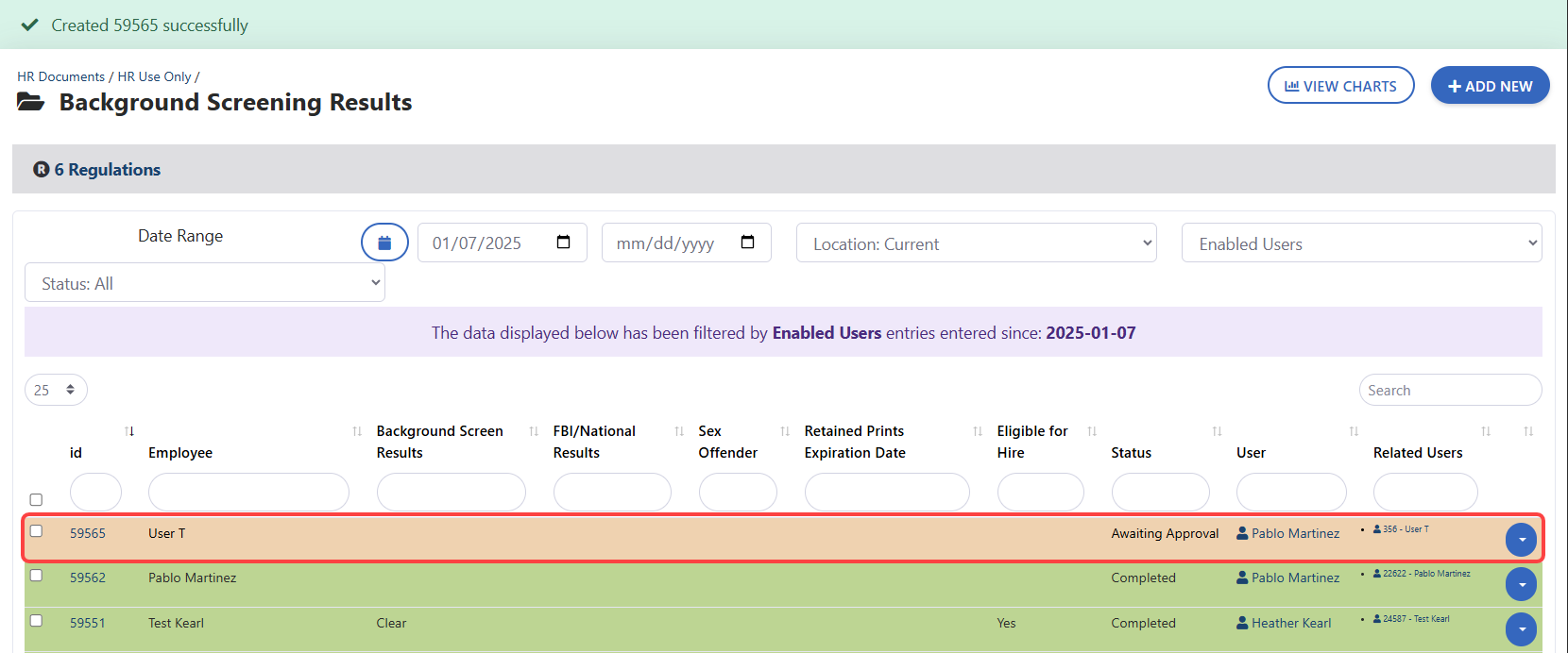 - A green confirmation message indicating the document was created successfully will appear at the top of the page. This page will display all versions of the document. The document we just saved appears at the top of the list, in the Awaiting Approval status.