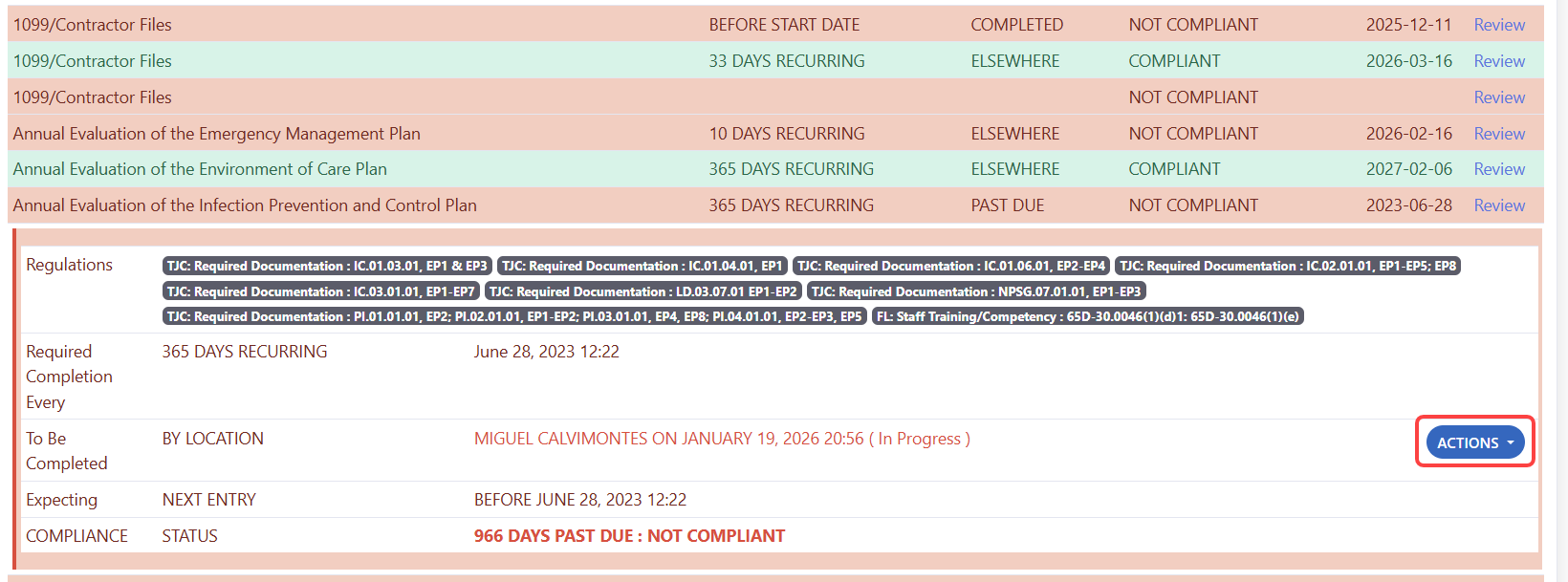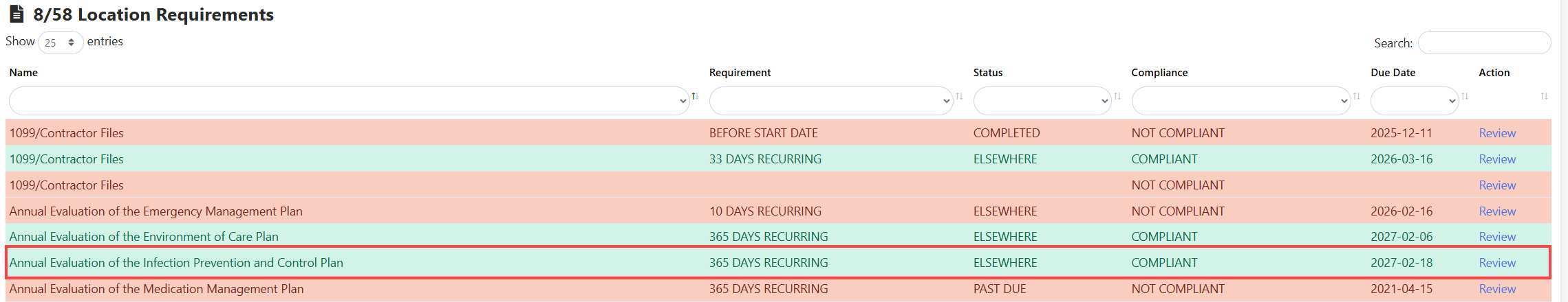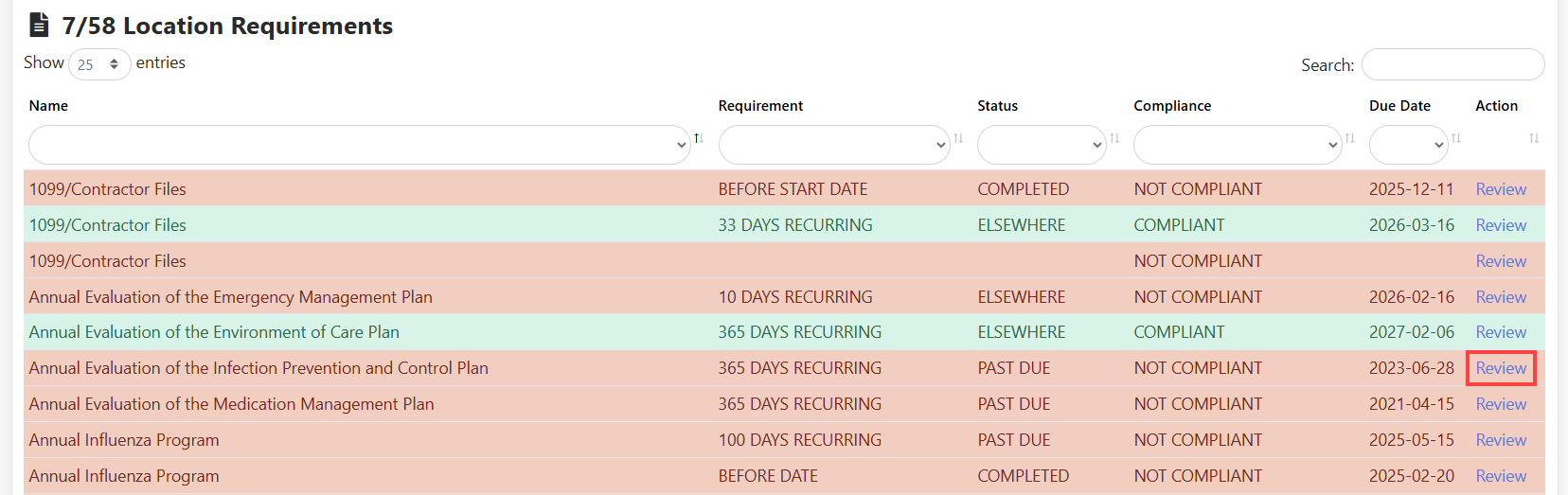 - Locate the compliance item you want to document elsewhere in the list. Click Review next to it in the Action column.