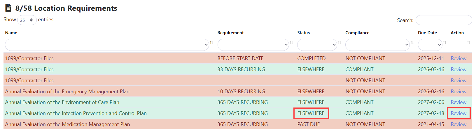 - Navigate to the compliance item with an ELSEWHERE status, and click on Review in the Action column.