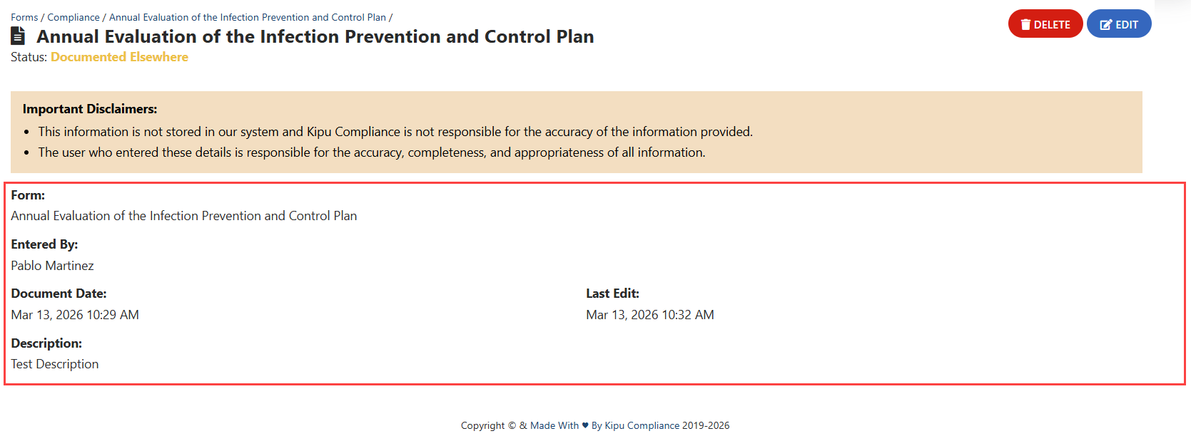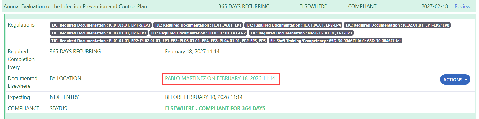 Documented Elsewhere entries are fully auditable and visible throughout Kipu Compliance.