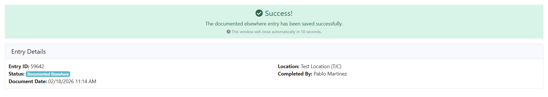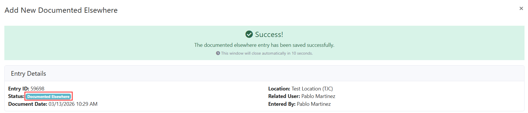 - The success message will appear confirming this documentation and verify the status updates to ELSEWHERE.