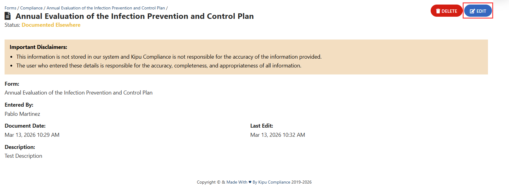 You can edit a Documented Elsewhere entry if updates are needed after it has been created. Editing an entry allows you to correct details, add documentation, or update links while keeping the compliance status intact.