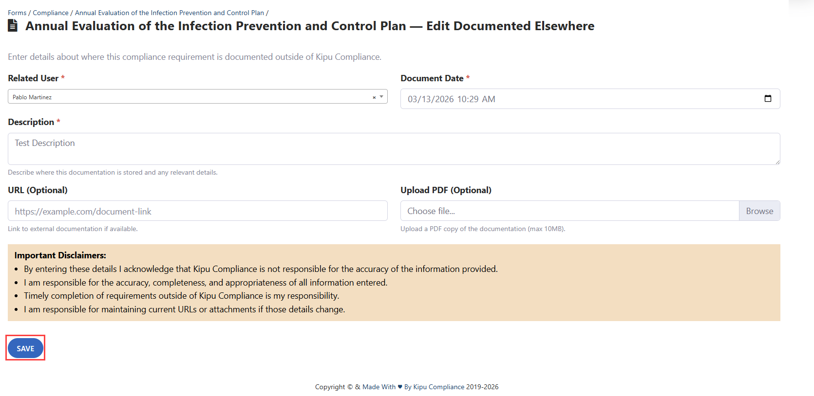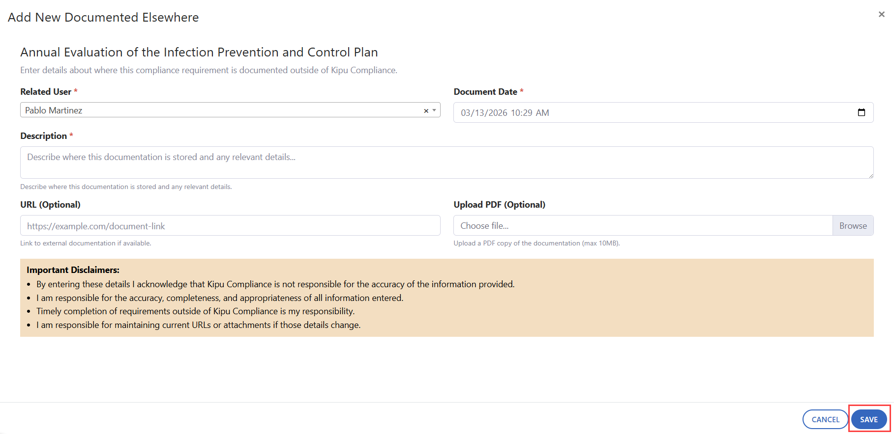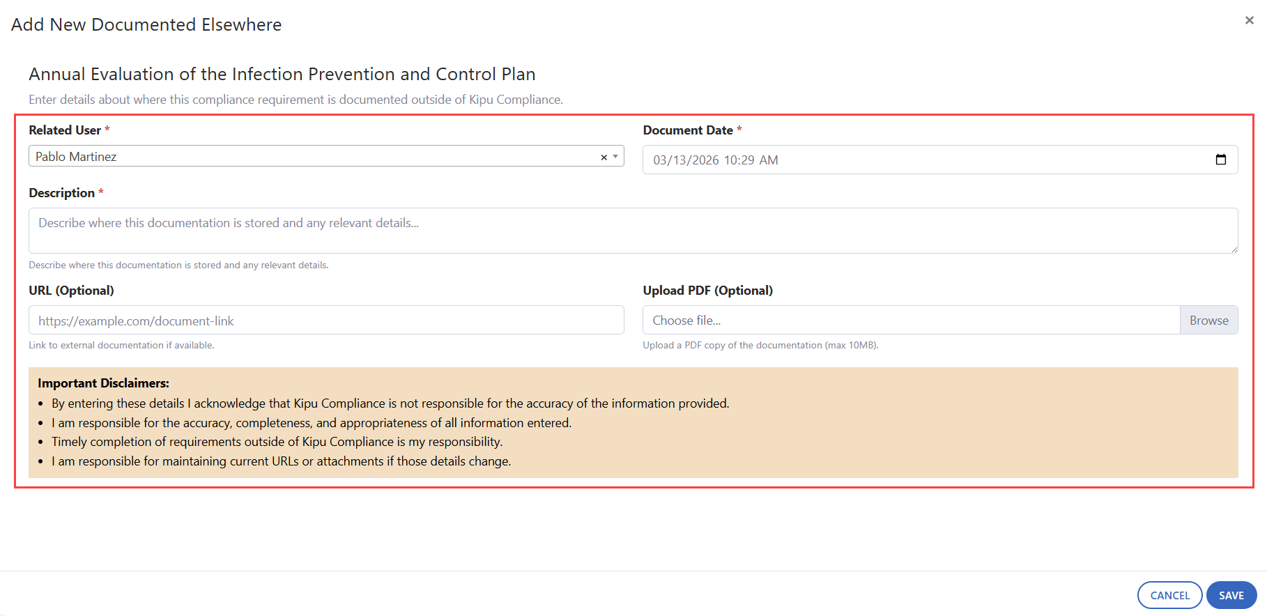 Use Documented Elsewhere when compliance documentation exists outside of Kipu Compliance and cannot be uploaded or completed directly in the system.