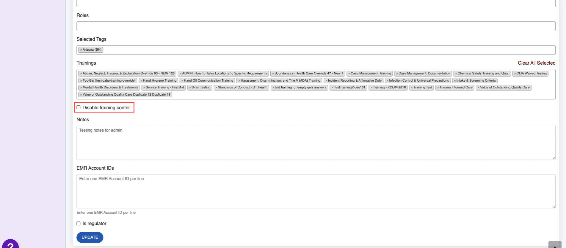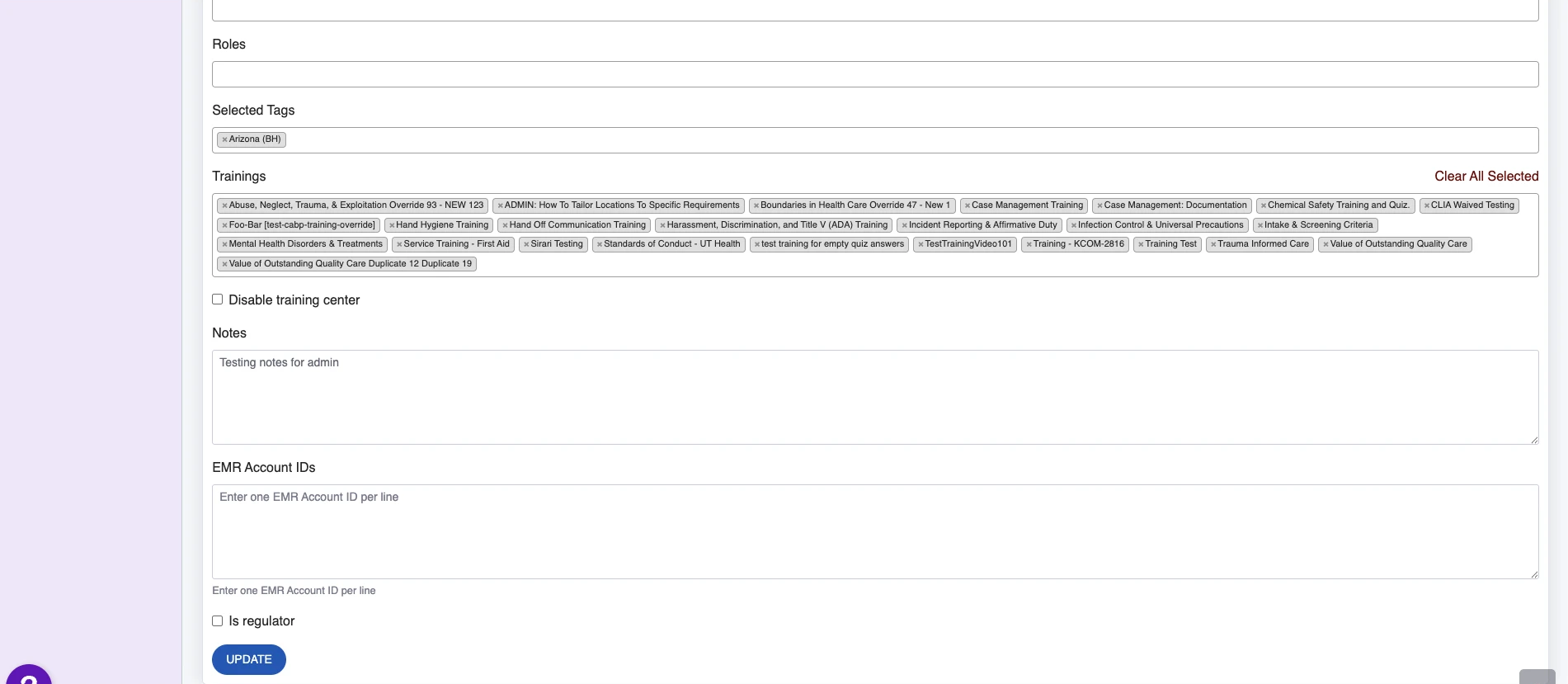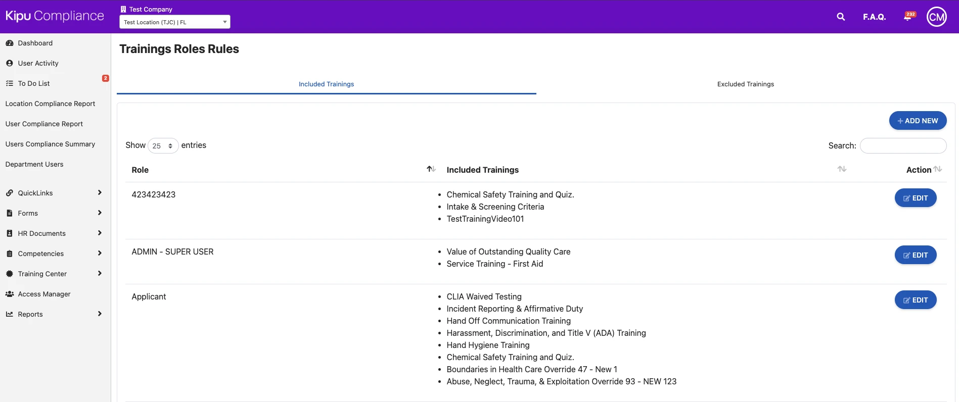 | Included Trainings | Add trainings to a role that weren't part of the default role assignment | Add "Fraud, Waste, and Abuse" to the "Direct Care" role at this location |