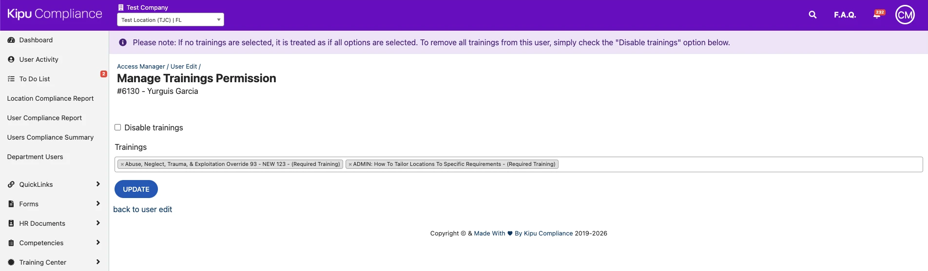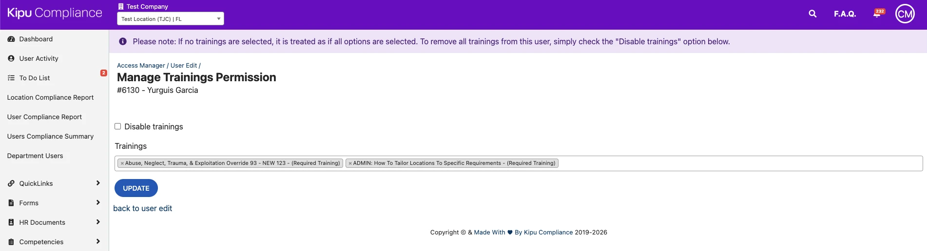| Check "Disable trainings" | Turns off ALL trainings for this user - their training list becomes completely empty. The trainings multi-select becomes disabled. |