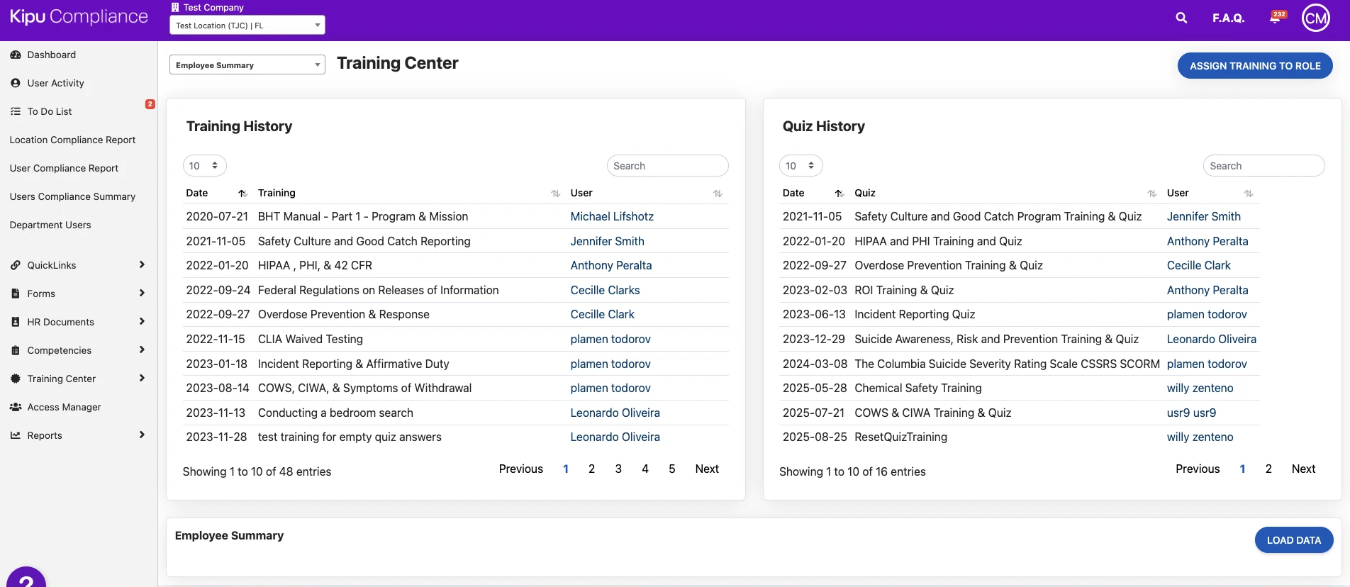 | Employee Summary | Same as above | Aggregated training compliance reports for the location |