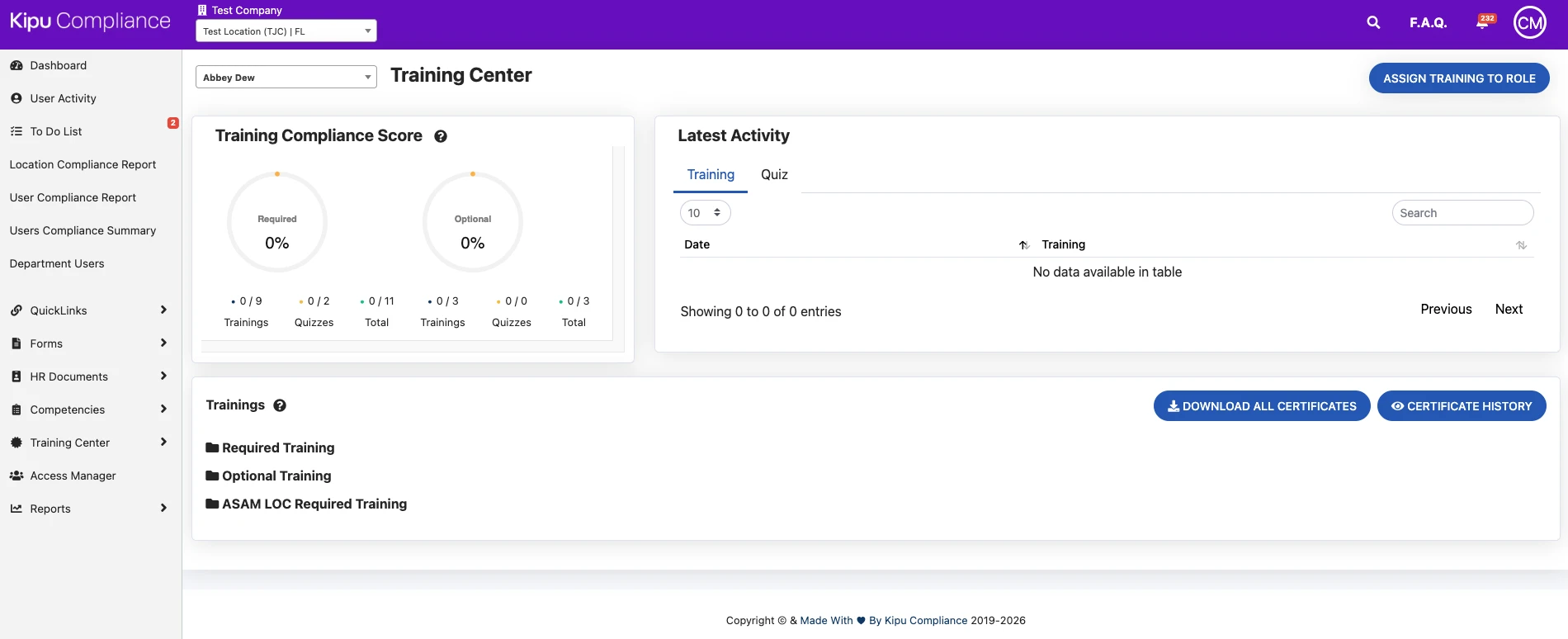 The Training Center allows users to complete required trainings and quizzes. Access and visibility are controlled through multiple layers, from location settings to individual user permissions. This article explains how access works, how trainings are assigned, and what users see.